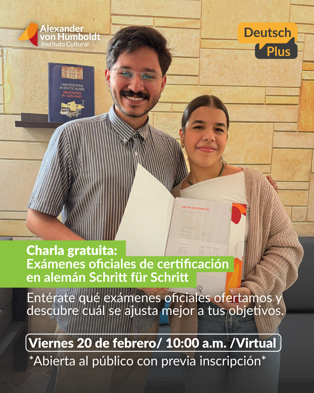 Conoce la información de fechas, tarifas e inscripciones. Contamos con variedad de ejercicios y simulacros diseñados para ayudarte a dominar el idioma. Nuestros ejercicios cubren todas las áreas clave, como comprensión auditiva, lectura, escritura y expresión oral. Además, nuestros simulacros de exámenes te permitirán familiarizarte con el formato y las exigencias de los certificados oficiales del idioma alemán.