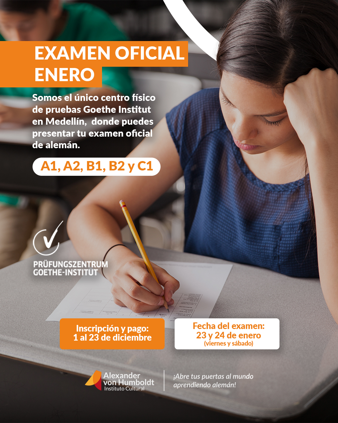 Somos una institución cultural sin ánimo de lucro ubicada en la ciudad de Medellín, Colombia. Promovemos el aprendizaje del alemán a través de una amplia oferta de cursos, actividades extracurriculares y exámenes oficiales del Goethe Institut.