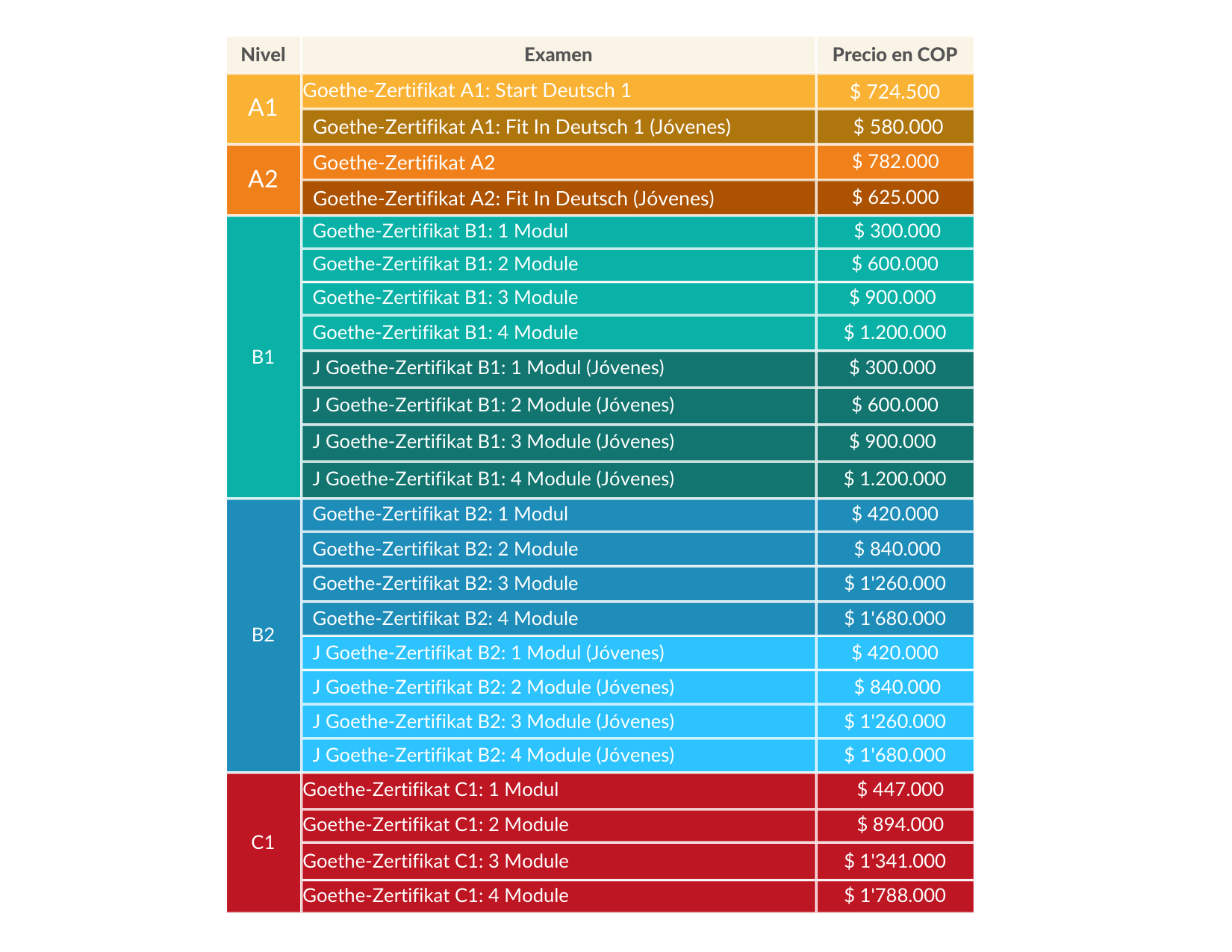 Te recomendamos inscribirte unas semanas antes a uno de nuestros cursos de refuerzo y preparación (Prüfungstraining). Estos cubren temas específicos para cada nivel y las cuatro habilidades que se certifican en el examen: Hören, Lesen, Schreiben y Sprechen.